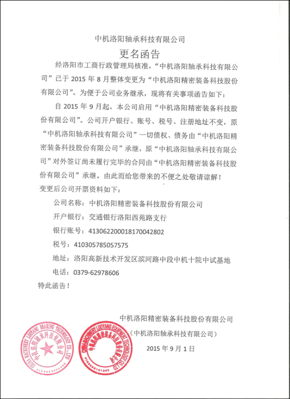 中機洛陽軸承科技有限公司更名函告